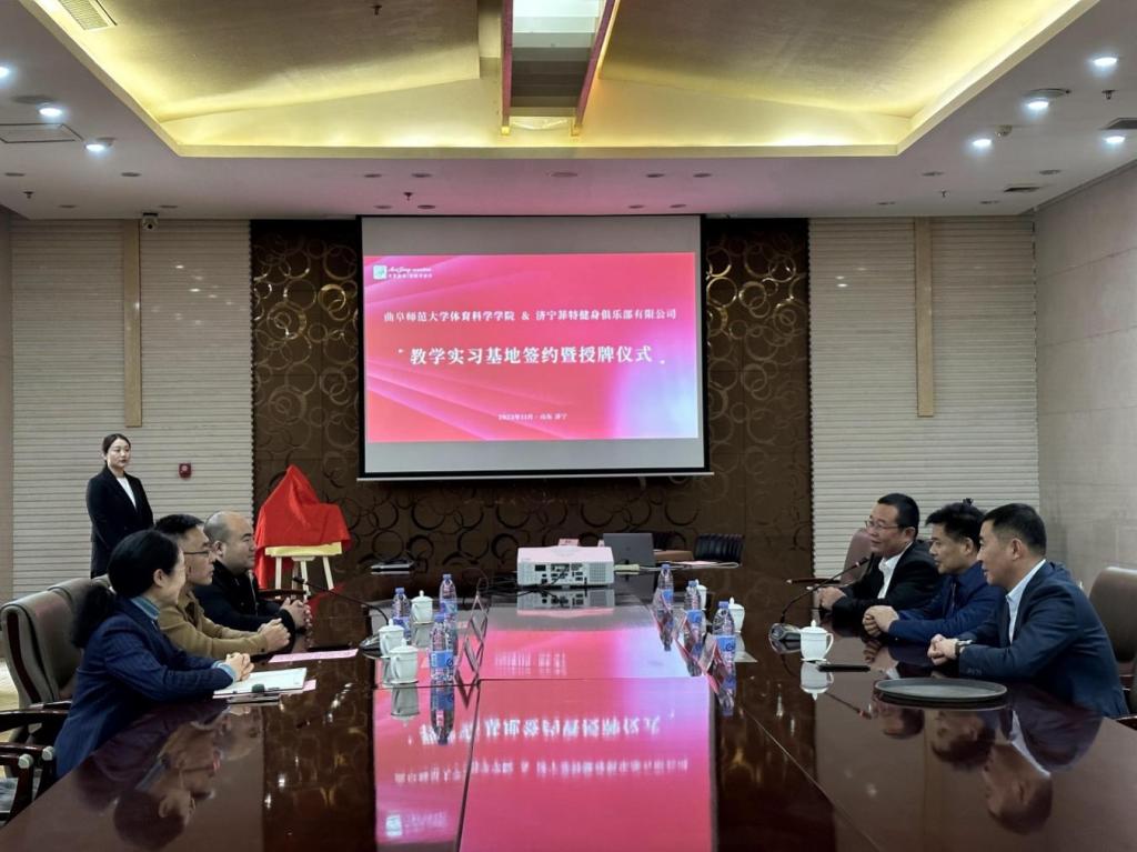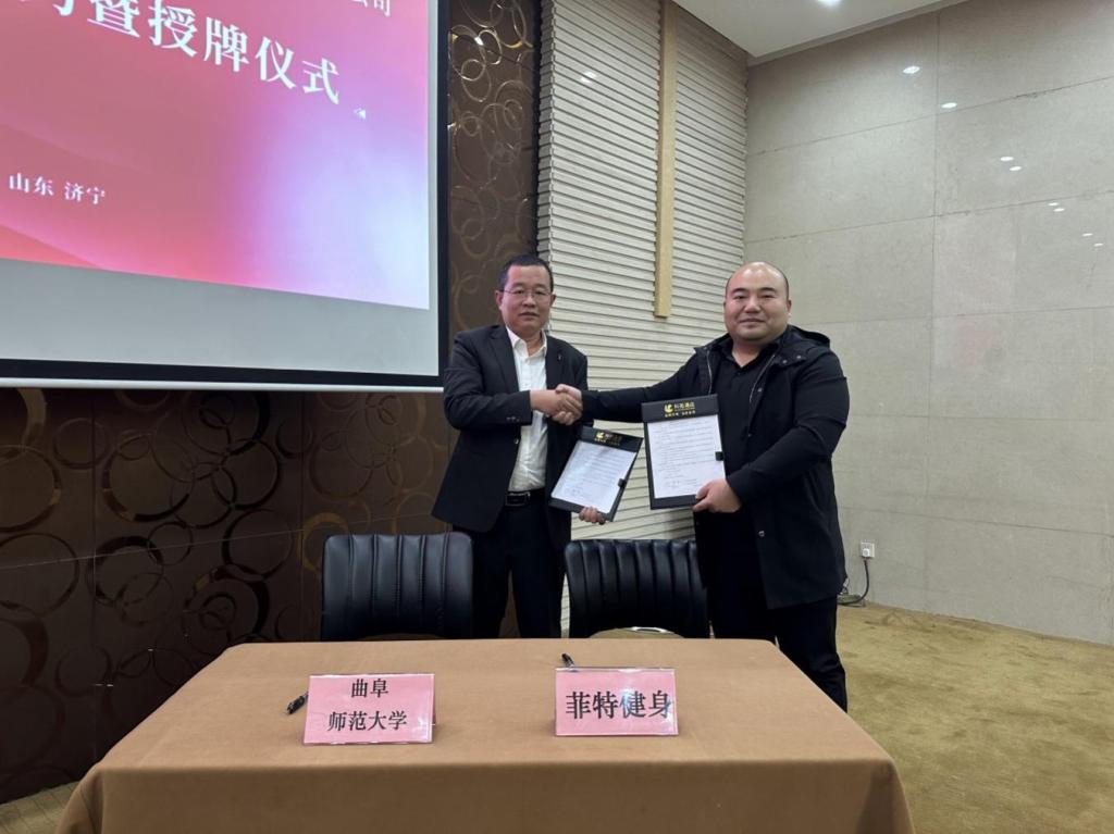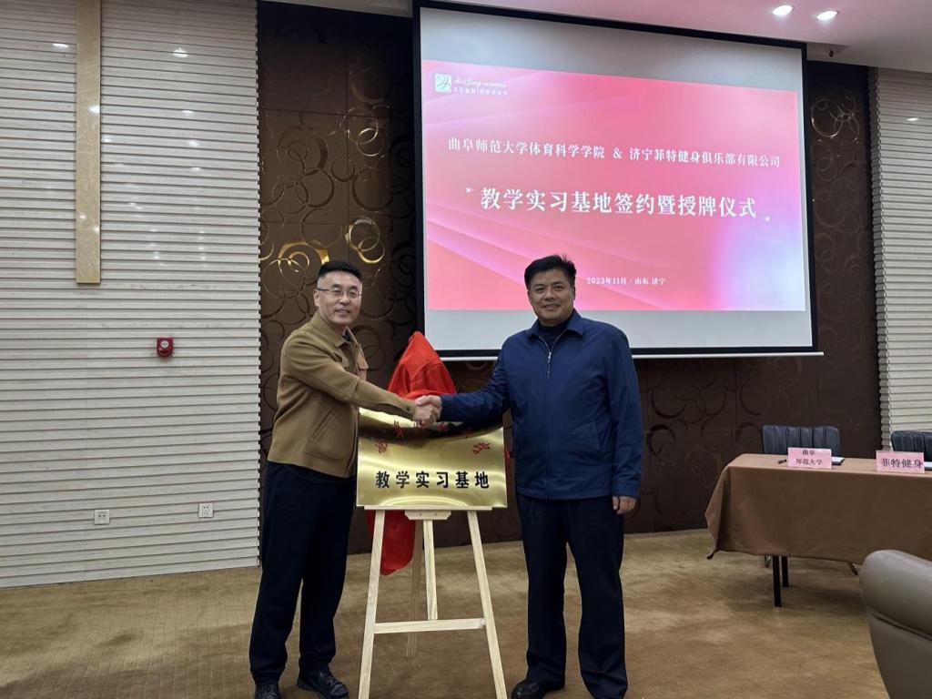 副院长伊超与济宁菲特健身俱乐部有限公司签署了曲阜师范大学教学实习基地协议。体育学部党委书记和济宁市美景投资股份有限公司董事长白毅共同为基地揭牌。