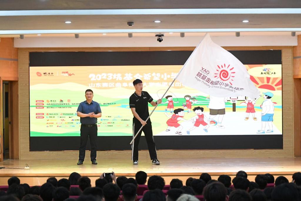山东省青少年发展基金会资助部部长董晓峰为志愿者代表李柯阳授姚基金希望小学篮球季旗,曲阜师范大学团委书记孔轶众为志愿者代表马蔓妮授姚基金希望小学篮球季支教志愿者旗。