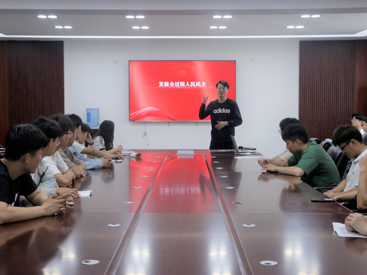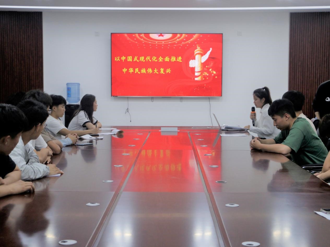 的学习贯彻习近平新时代中国特色社会主义思想学生宣讲团就“两个结合”的相关内容为在场学生代表做宣讲报告。宣讲团不仅让在场学生全面了解“坚持和发展中国特色社会主义政治宣言和行动纲领”,还结合身边实例生动形象地讲述了“发展全过程人民民主”这一重要课题,最后通过“以中国式现代化全面推进中华民族伟大复兴”的心得体会激励莘莘学子立大志、明大德、成大才、担大任的信心与决心。