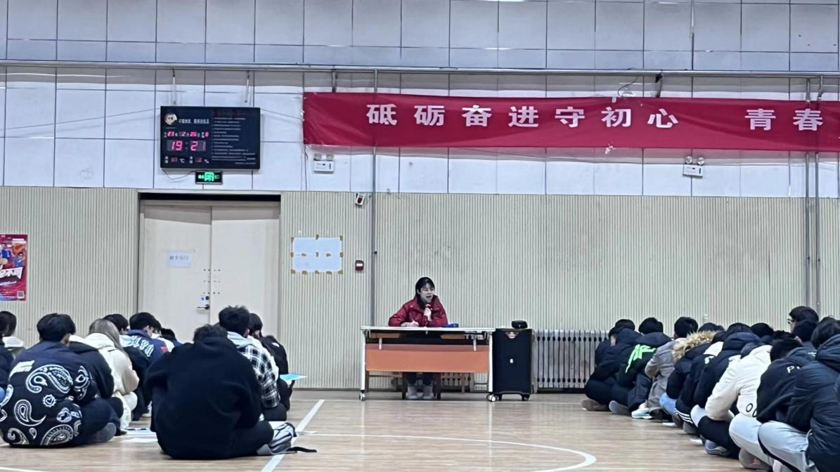 篮球馆召开全体学生会议暨安全教育大会,2022级辅导员王冰主持会议,2022级全体学生参会。