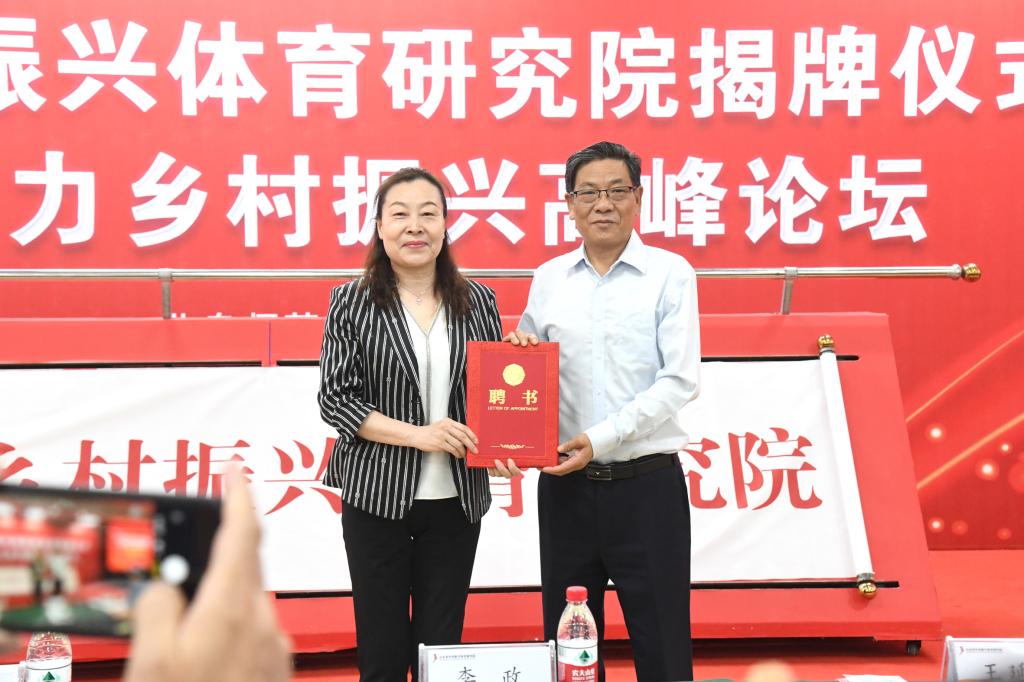 山东省体育局党组书记、局长李政为曹莉教授颁发“山东省乡村振兴体育研究院”院长聘书。