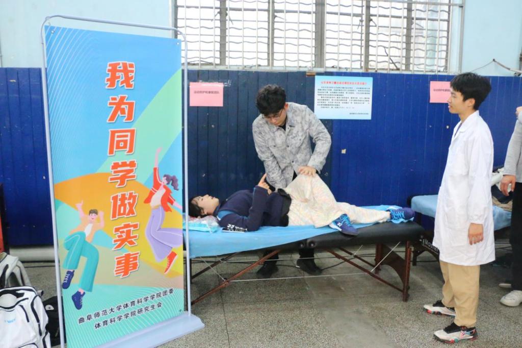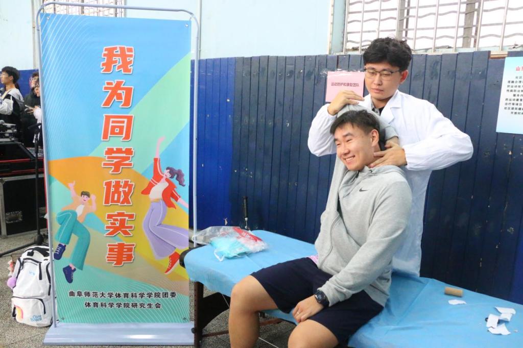 还结合“体卫融合”项目,开展体质健康监测与运动损伤防护服务。通过体态评估、柔韧性测试等方式,让老师和同学们清晰了解自己的体态及体能状况。针对检测中发现的问题,由专业教师和康复师团队现场指导康复动作,演示自我按摩与拉伸方法。对老师和同学们而言,这套服务不仅解决了眼前的酸痛,更教会了他们自我保健的方法。活动组织教师认为,将专业服务嵌入体育赛事,是“我为同学做实事”的生动体现。
