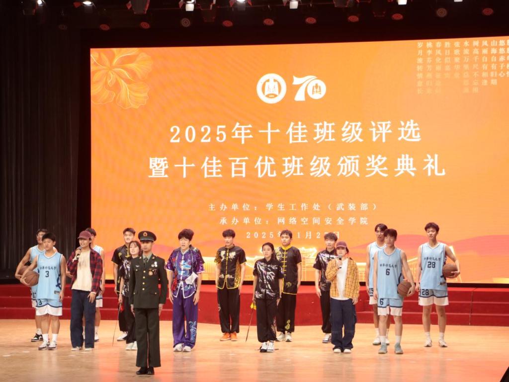 此次评选中,2023级体育教育三班作为“十佳班级”得主,以“文武兼修、活力迸发”为班级底色,不仅在学业上互助共进、体育专业成绩稳居年级前列,更在集体活动中展现超强凝聚力。班级精心编排的节目《韵动三班:武藏锋芒,篮舞飞扬》在评选现场惊艳亮相,将武术的刚劲利落与篮球的灵动洒脱完美融合,学子们拳脚间尽显体育豪情,跳跃中洋溢青春活力,赢得评委与现场观众的一致好评。