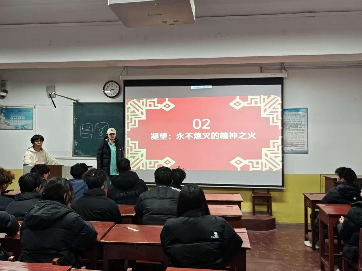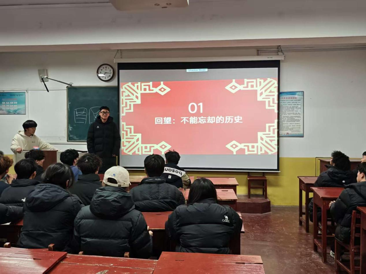 活动中,团支书通过PPT讲解与历史影像资料相结合的方式,带领同学们重温了1935年北平学生在国家危难之际挺身而出、开展抗日救亡运动的壮烈历程。同学们认真聆听,共同感受那段充满热血与呐喊的青春历史。