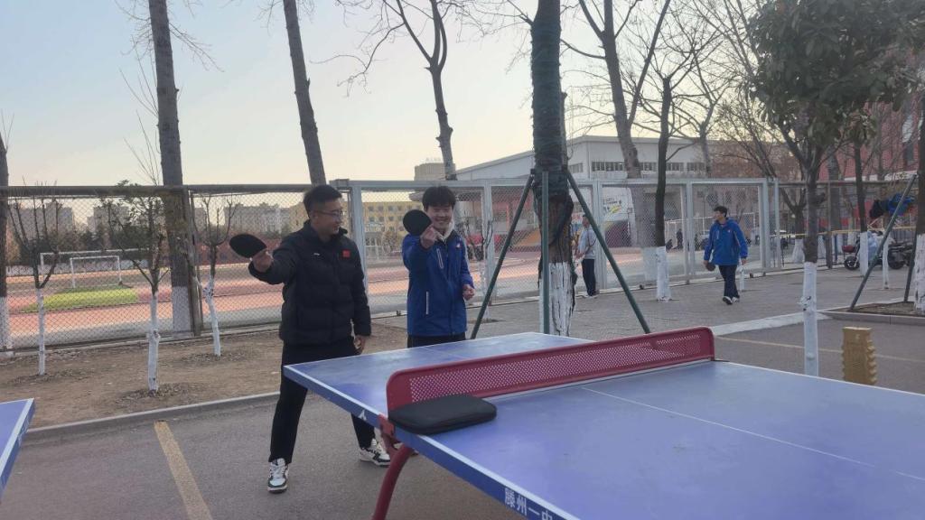 在滕州一中体育场乒乓球台前,实践队员准备就绪,他们以专业水准展示正手攻球、反手推挡、弧圈球等技术,引得围观同学连连喝彩。队员们放慢节奏,一边与学生对打,一边讲解步法移动、旋转判断和落点控制的技巧。短短十几分钟,同学们不仅体验到运动的快乐,更感受到体育教学的专业与温度。