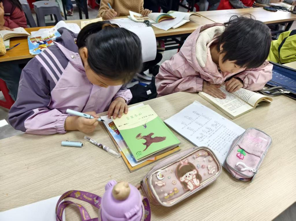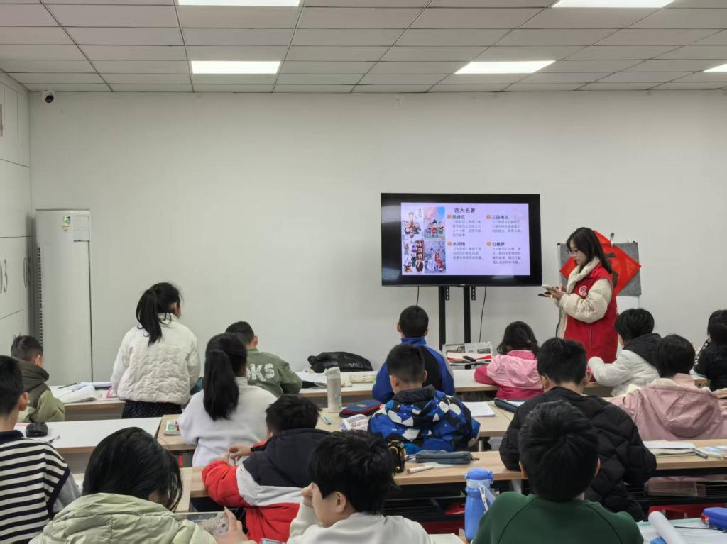 学子忙碌的身影。他们化身“小老师”,有的在书桌前耐心辅导孩子们完成寒假作业,细致讲解每一道难题,帮助孩子们巩固知识;有的则通过生动的多媒体课件,带领孩子们走进“四大名著”的世界,从经典故事中感受中华优秀传统文化的魅力;还有的结合体育专业特色,穿插了趣味体育游戏和科学健身指导,在轻松互动中激发孩子们的运动热情,传递健康生活理念。此外,志愿者们还协助开展了安全教育、阅读陪伴等活动,全方位守护孩子们的成长。